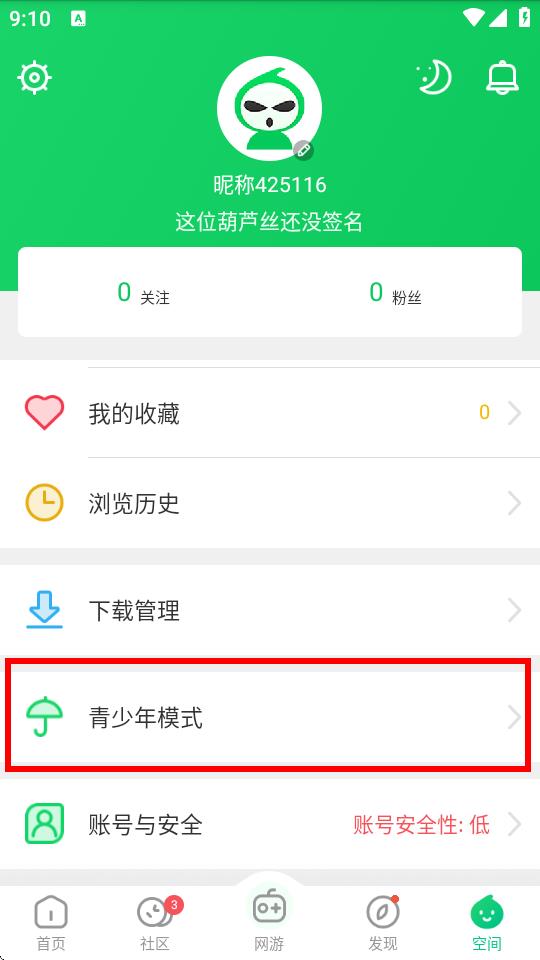2、在个人空间页面中,找到并点击青少年模式选项。