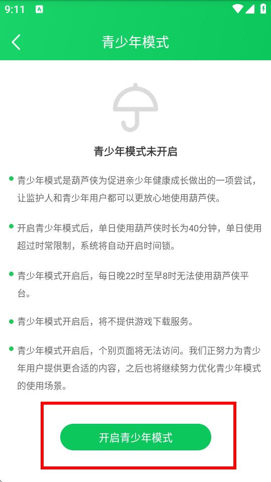 3、进入青少年模式页面后,点击开启青少年模式按钮,按照提示完成操作即可开启。