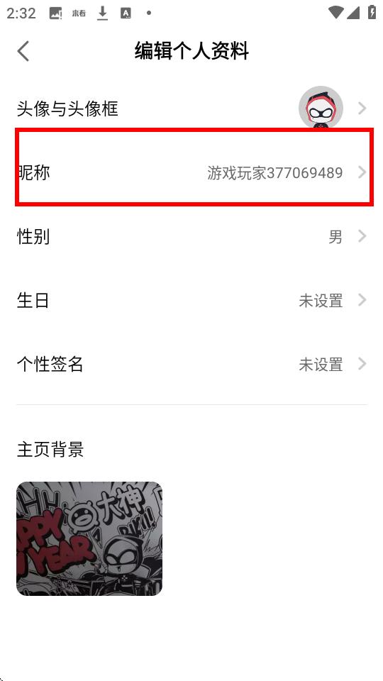 4、在编辑个人资料页面,找到昵称选项并点击,即可修改名字。