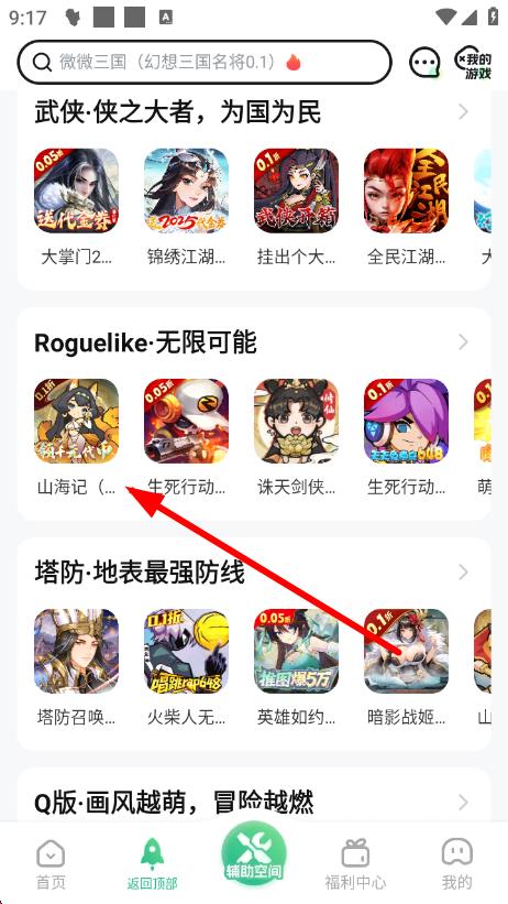 2、在游戏库中,按分类浏览找到感兴趣的游戏,比如在Roguelike分类里找到山海记。