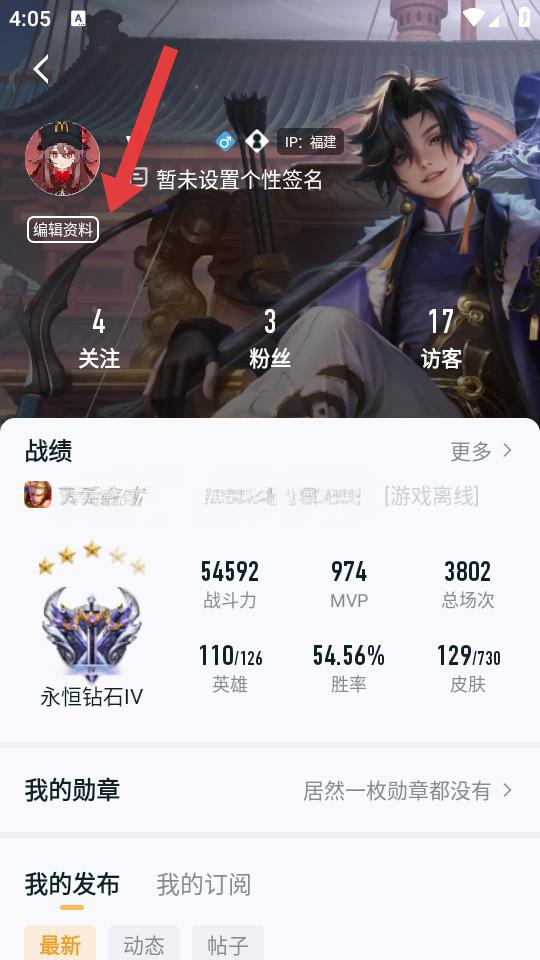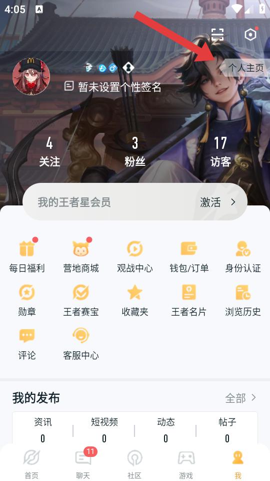 1、打开王者营地APP,点击底部导航栏我进入个人中心,再点击右上角个人主页按钮,进入个人主页页面。
