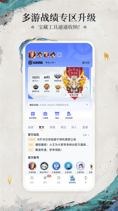 了解官方最新资讯、看直播、找攻略、参与活动,发现王者新鲜事;