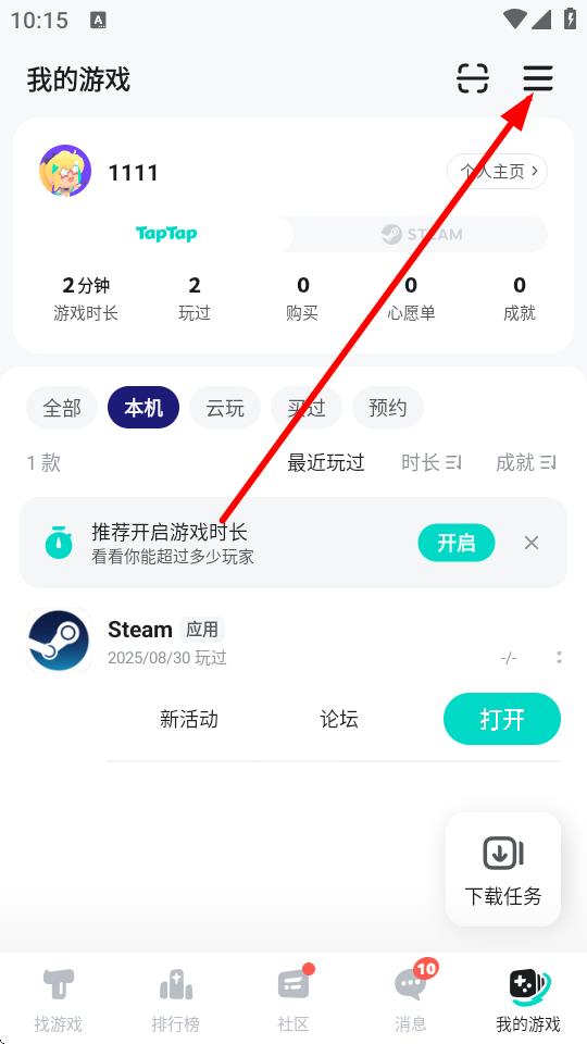 1、打开Taptap应用进入我的游戏页面,点击右上角三条横线图标进入设置界面。