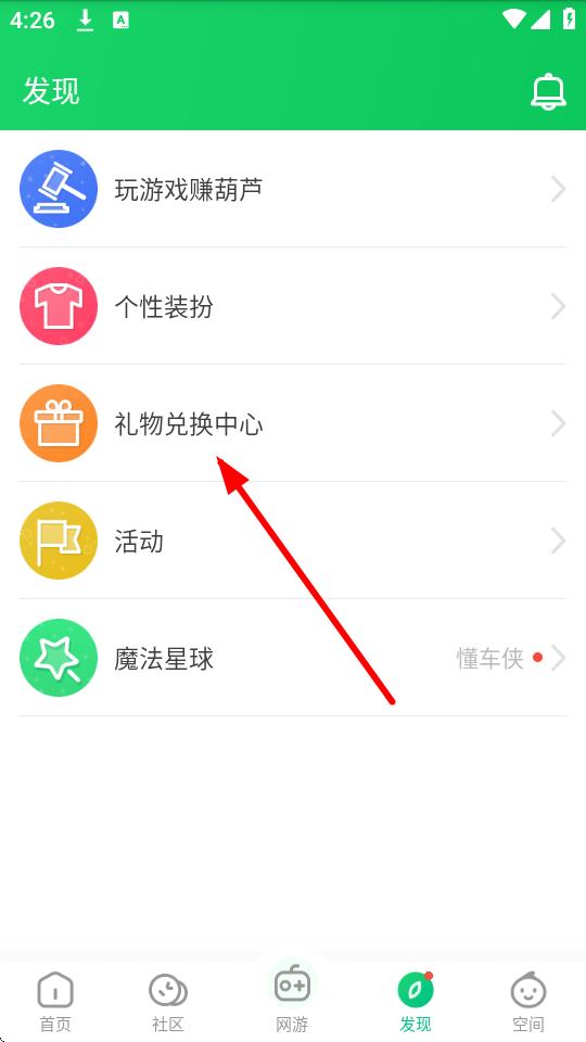 2、在发现页面里,找到并点击礼物兑换中心选项,进入兑换界面。