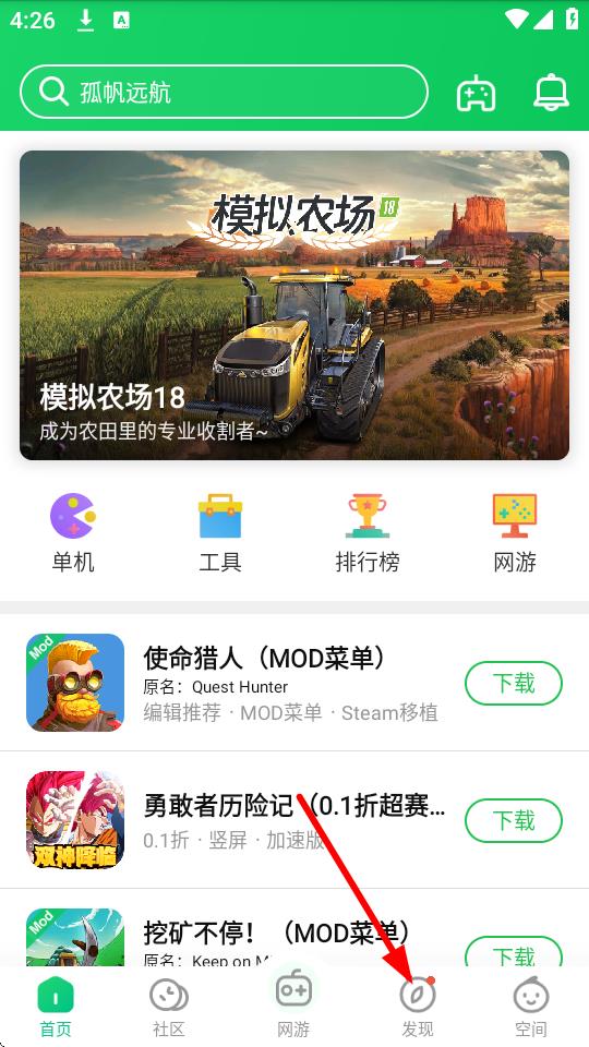 1、打开葫芦侠应用,点击底部导航栏中的发现选项,进入发现页面。