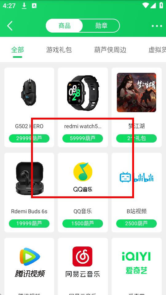3、在礼物兑换中心的商品列表中,选择想要兑换的商品,比如QQ音乐权益。
