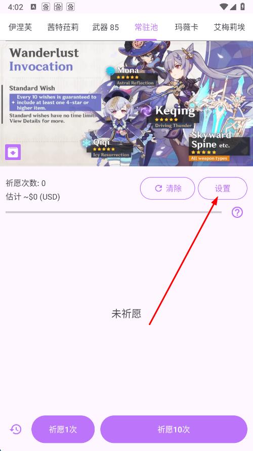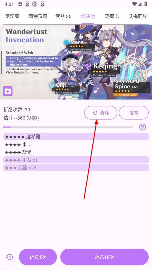 1、在原神抽卡模拟器界面,找到清除按钮并点击,可清除当前显示的祈愿次数和抽卡结果记录 。