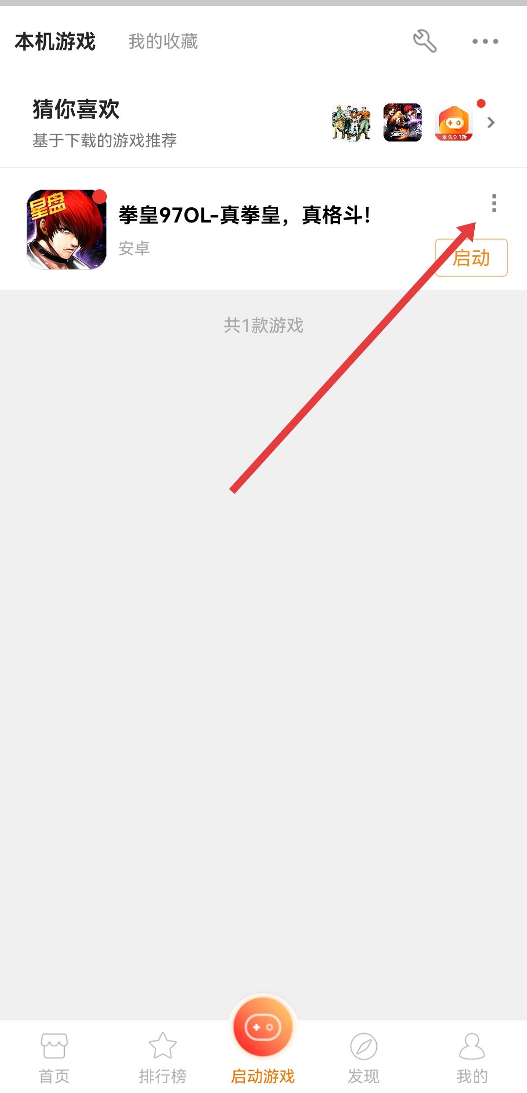 1、进入悟饭游戏厅启动游戏页面后,找到要删除安装包的游戏,点击游戏右侧的竖向三点按钮。