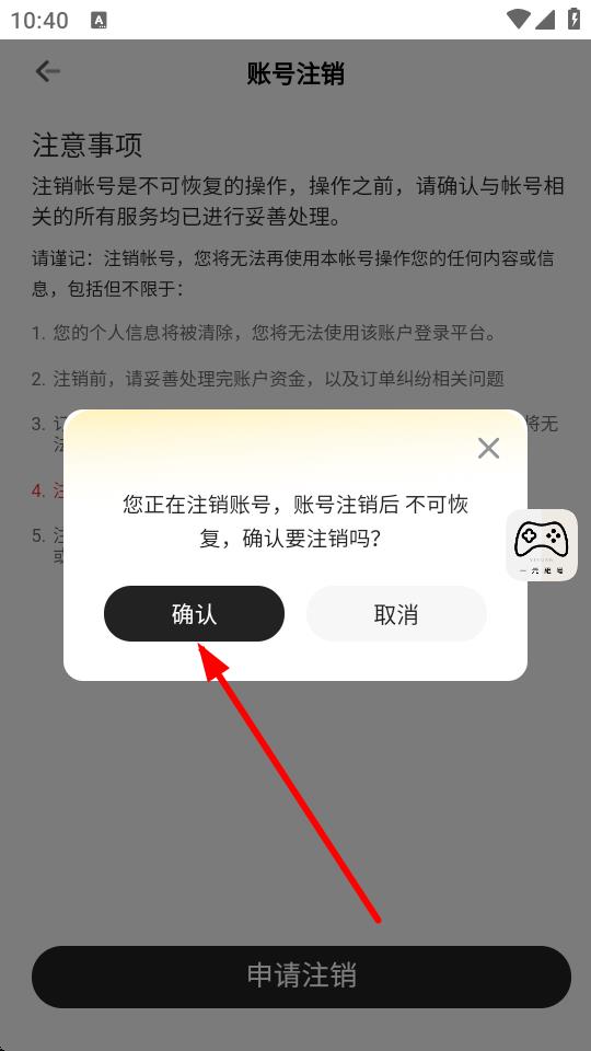 4、在弹出的确认窗口中,点击确认,即可完成账号注销操作。