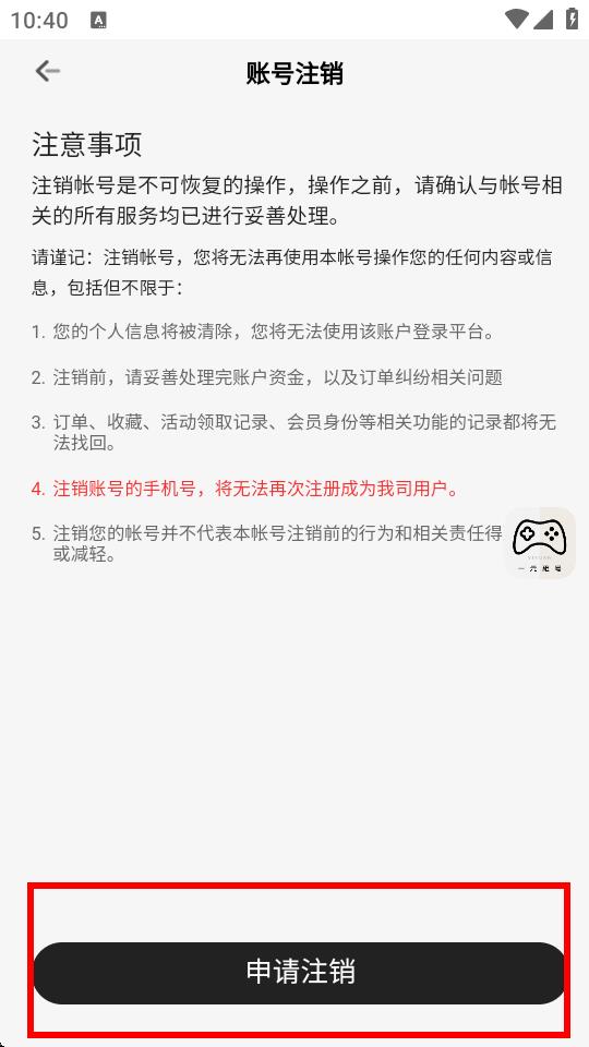 3、进入账号注销页面,仔细阅读注意事项,确认已妥善处理与账号相关的所有服务,如账户资金、订单纠纷等问题,点击申请注销。