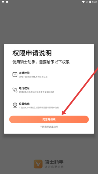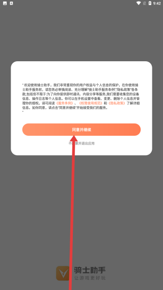 1、打开骑士助手时,会弹出隐私政策说明弹窗,点击同意并继续按钮,接受相关条款,进入下一步权限申请界面。