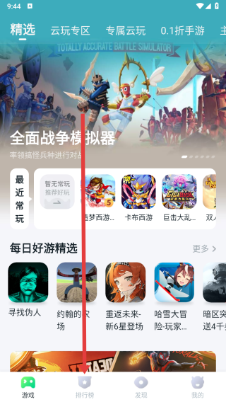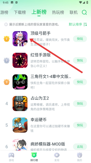 1、进入到应用首页后,可以点击下方排行榜按钮,进入查看最新游戏。