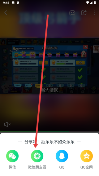 4、可以通过点击弹窗中图标分享,如点击使用微信朋友圈的方式进行分享游戏。