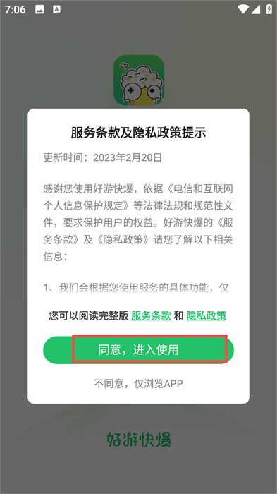 1、在本站下载软件安装包,可以直接在手机桌面上打开会出现隐私条款提示,需要点击【同意,进入使用】,如下图展示;