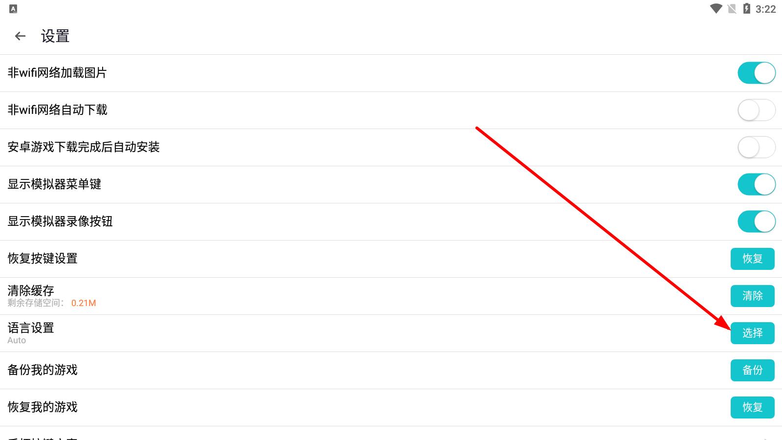 3、进入设置界面后,下滑找到语言设置,点击其右侧的选择按钮。