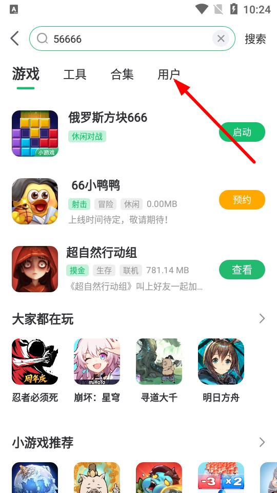 3、输入完成后点击键盘上的搜索按钮,在搜索结果页面中点击用户选项卡,即可查找对应用户。