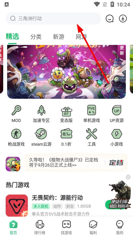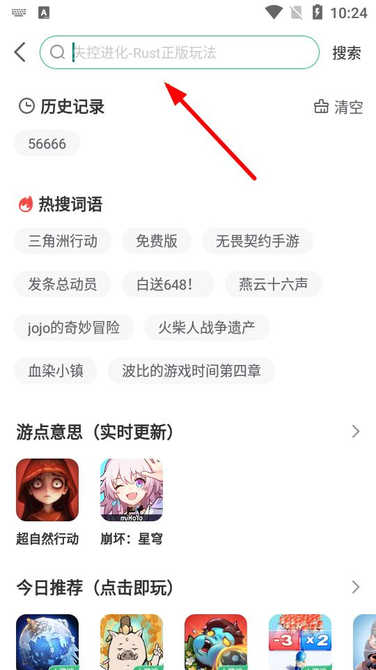 1、打开7723游戏盒APP,在首页界面中点击上方的搜索框,准备进行搜索操作。