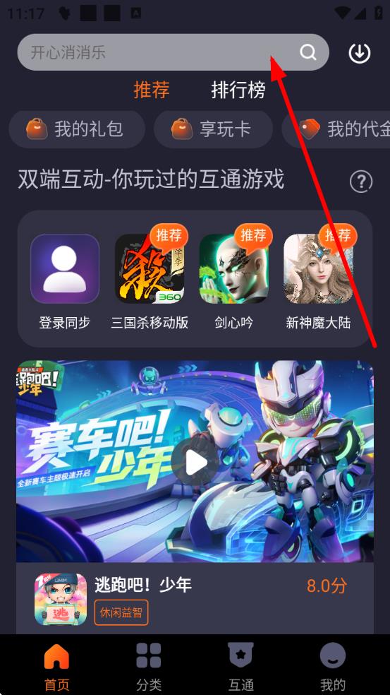 1、打开360游戏大厅APP,点击首页上方的搜索框,进入游戏搜索界面。