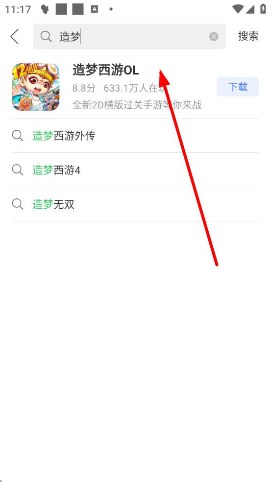 2、在搜索框中输入造梦西游,在搜索结果里找到造梦西游OL并点击进入游戏详情页。
