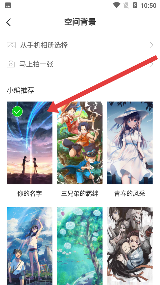 3、在空间背景界面中,可选择从手机相册选择、马上拍一张或小编推荐中的背景图,点击即可设置为空间背景。