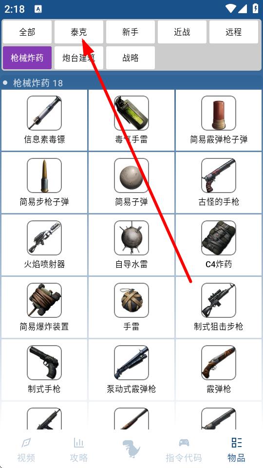2、进入物品界面后,在上方分类标签中点击泰克选项。