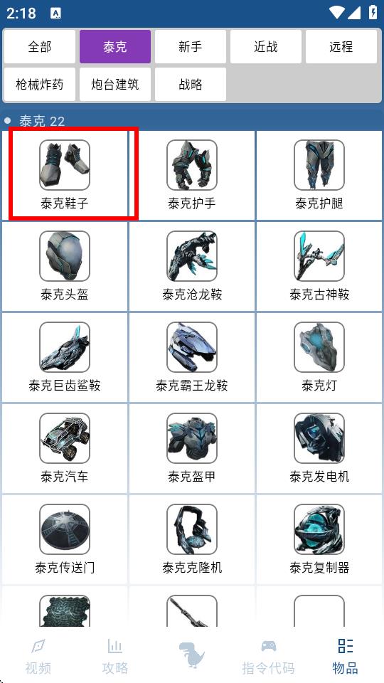 3、在泰克分类下,会展示各种泰克物品,找到你想查看属性的泰克物品,比如泰克鞋子,点击该物品图标。