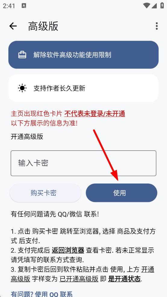 3、在高级版页面的开通高级版区域,输入获取到的卡密,点击使用按钮,即可开通高级版句号。