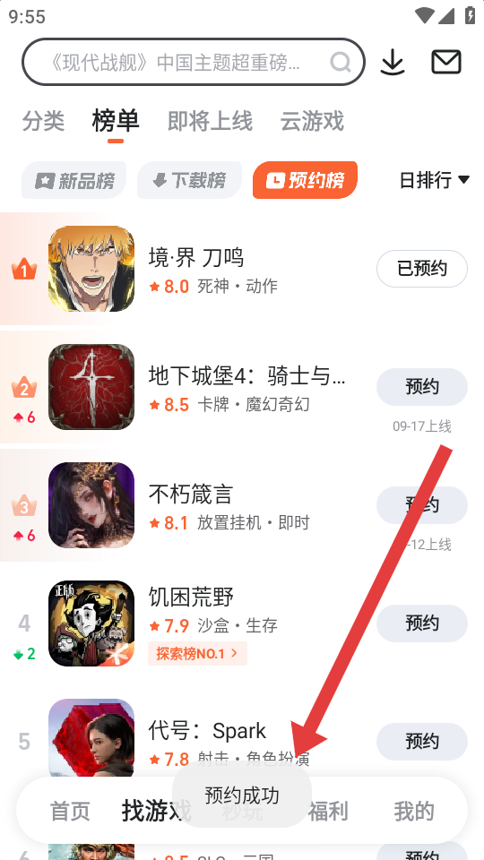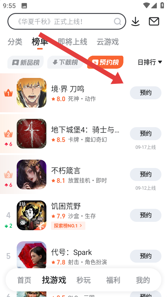 1、进入九游找游戏的页面,需要切换到榜单-预约榜,找到想预约的游戏,点击右侧预约的按钮。