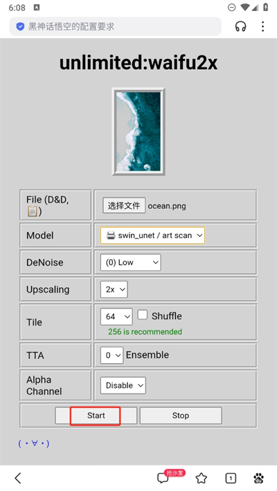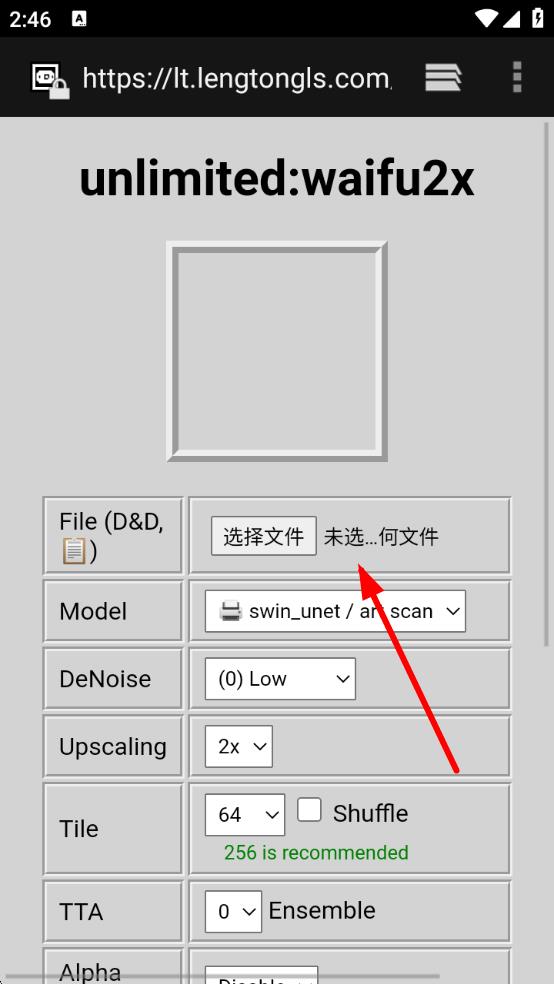 3、在浏览器打开的unlimited:waifu2x页面中,点击选择文件按钮,按后续指引选择需要修复的文件,并设置相关参数完成文件修复操作。