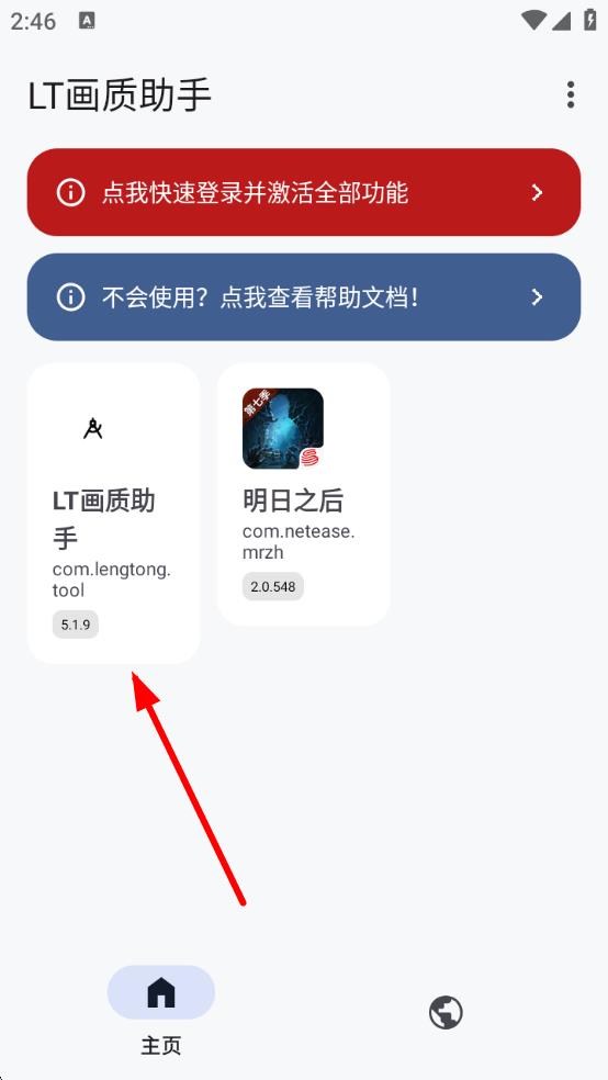 1、打开LT画质助手应用,在主页点击LT画质助手字样所在区域,触发相关操作选项。