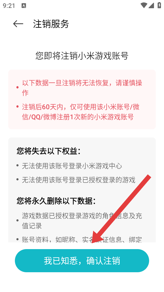 4、在注销服务页面,仔细阅读注销提示后,点击我已知悉,确认注销按钮,完成账号注销操作。
