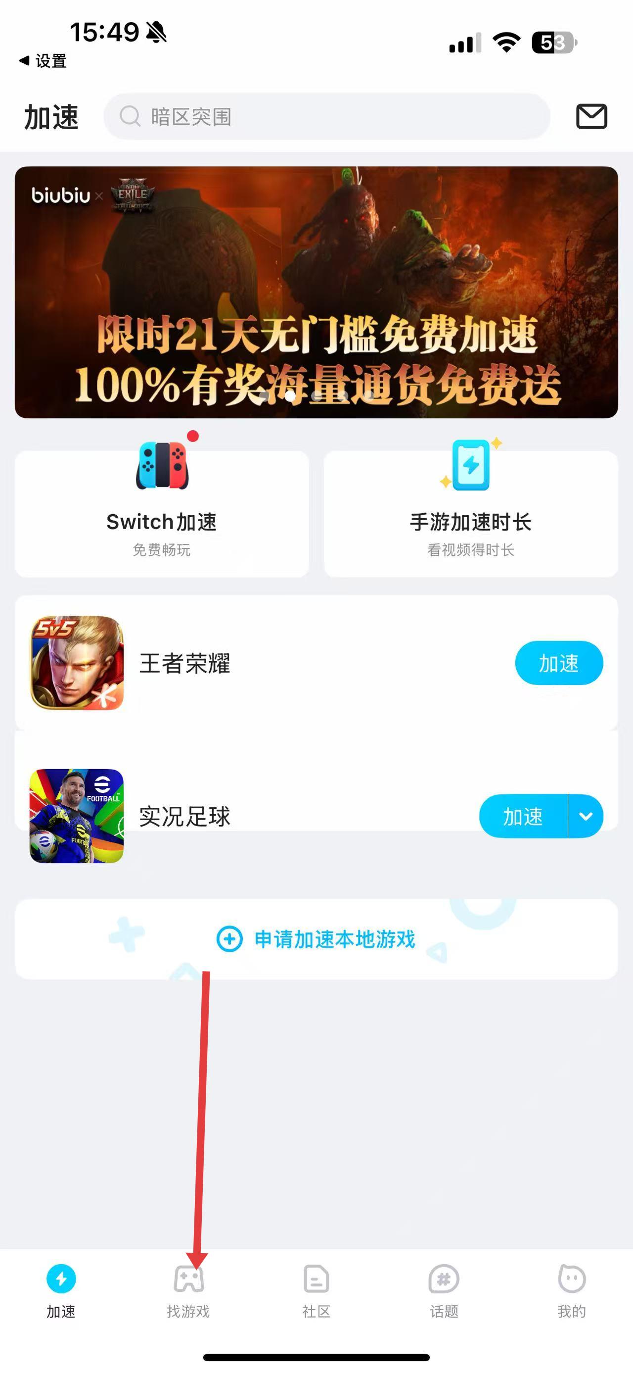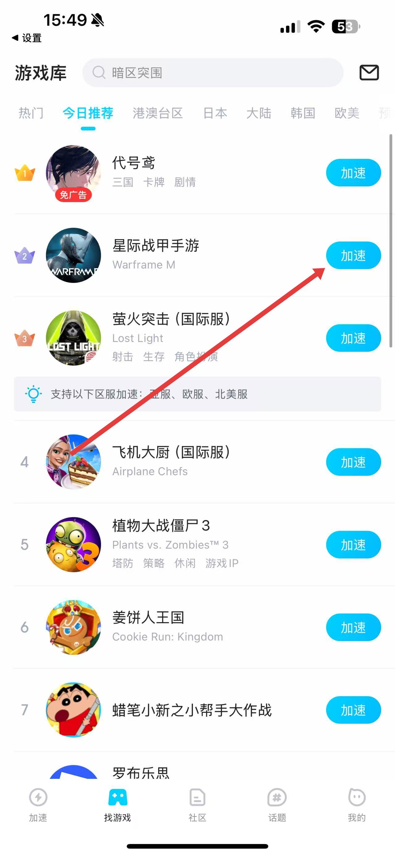 2、在游戏库中,选择任意一款游戏,点击其右侧的加速按钮,触发实名认证提示若未触发,可查看是否有其他入口引导实名认证。