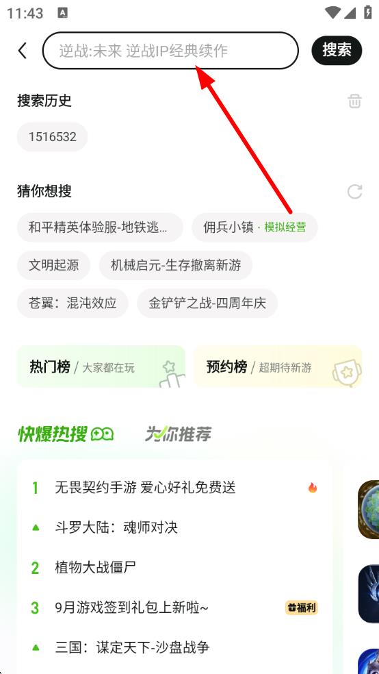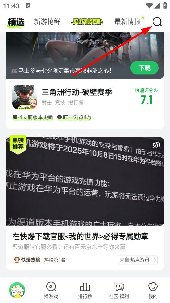 1、打开好游快爆APP,点击首页右上角的搜索图标,进入搜索页面。
