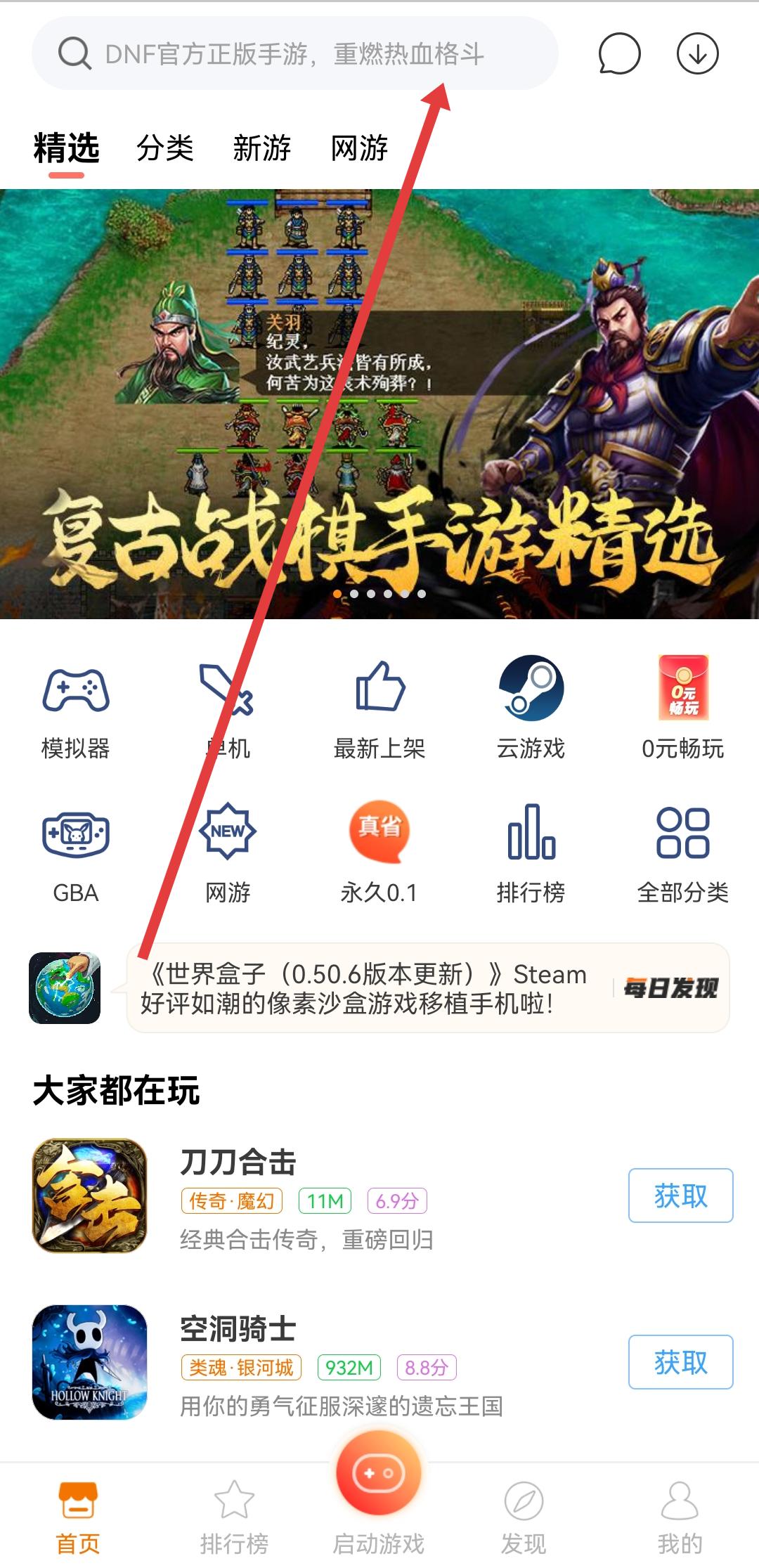 1、进入悟饭游戏厅首页后,点击顶部的搜索栏,输入拳皇进行搜索,这是查找拳皇游戏的关键入口。