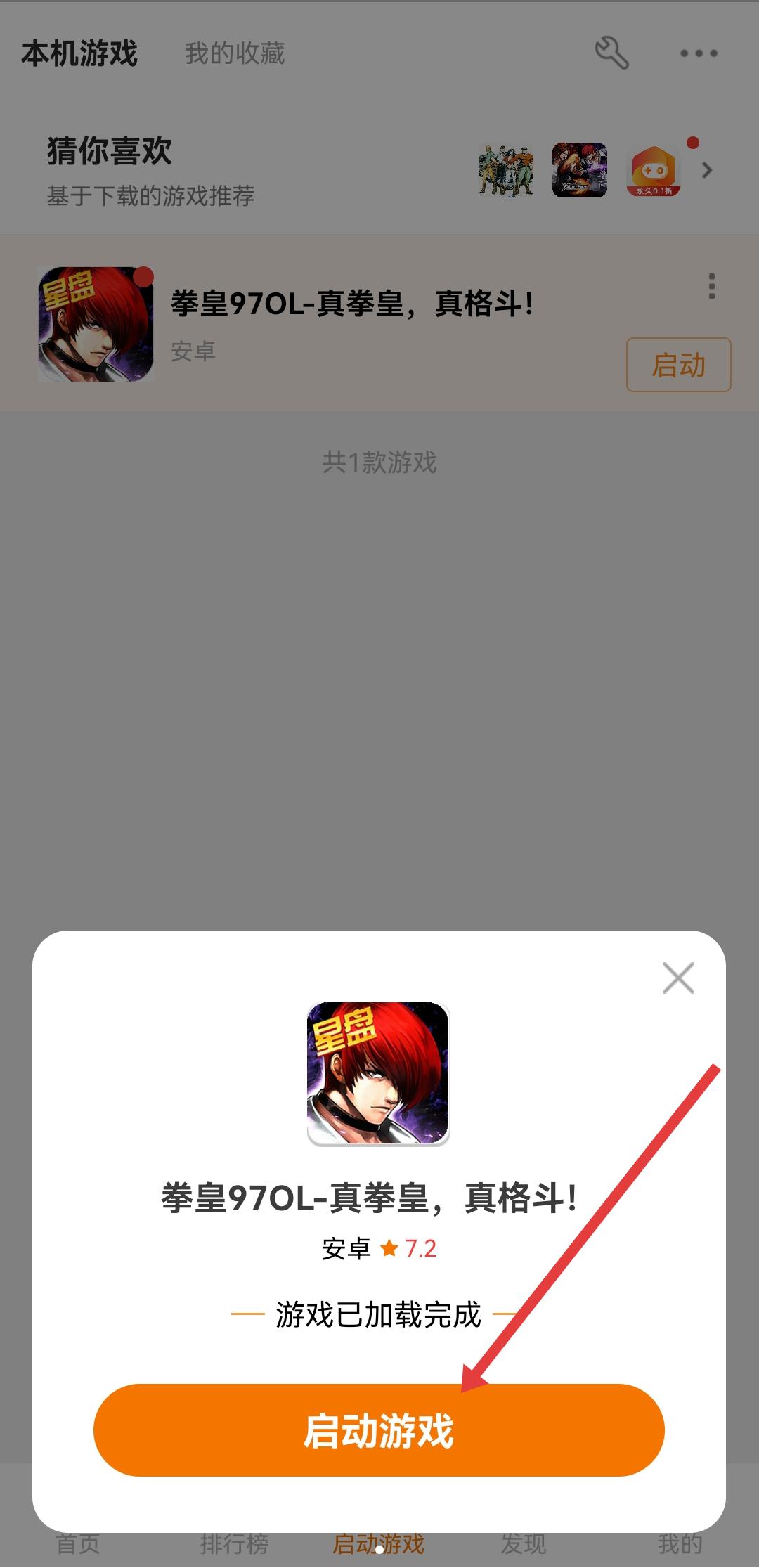 3、游戏下载完成后,会弹出启动游戏提示框,点击橙色的启动游戏按钮,即可进入拳皇游戏开始游玩。