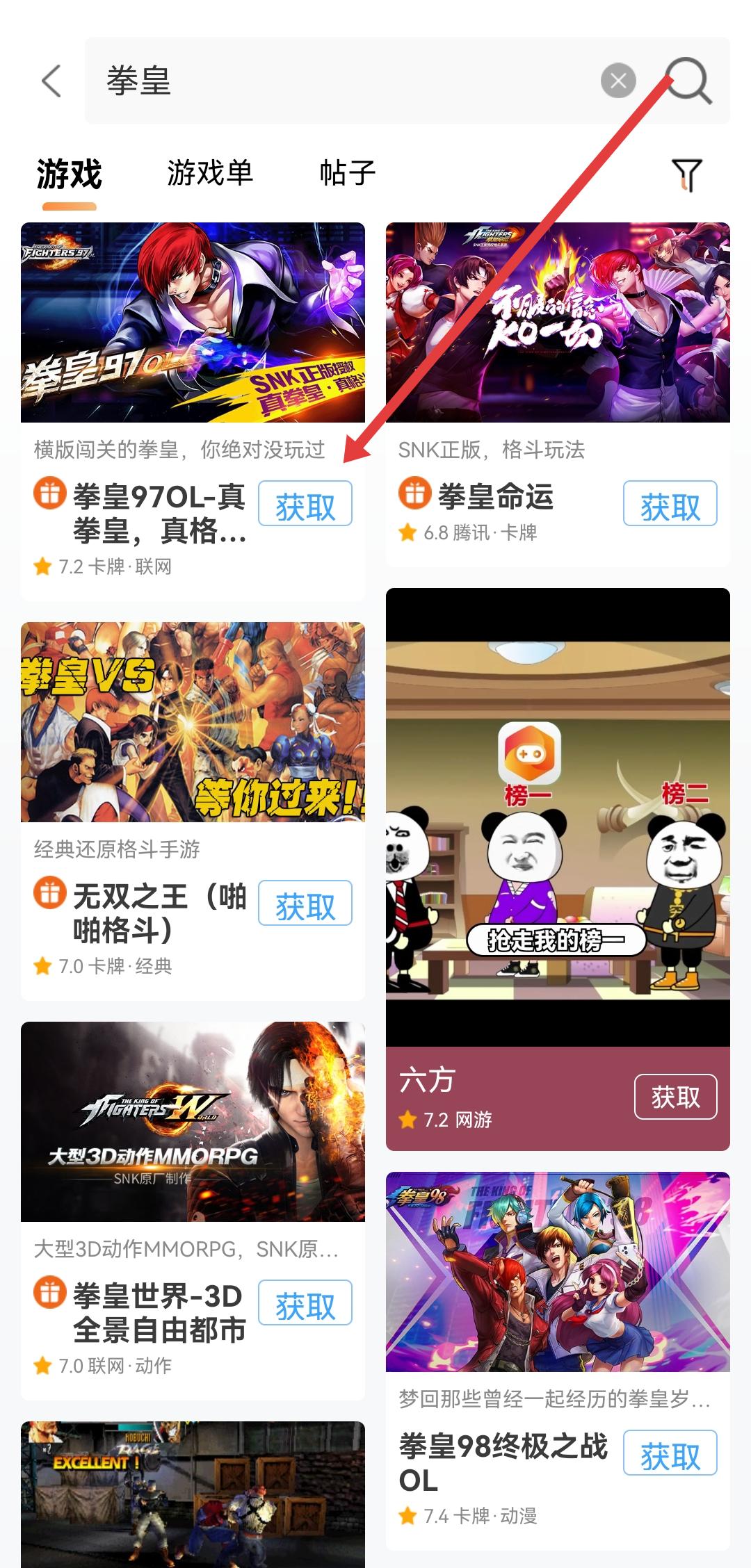 2、在搜索结果页面中,找到想要游玩的拳皇游戏,点击游戏下方的获取按钮下载游戏,完成下载后才能启动游玩。