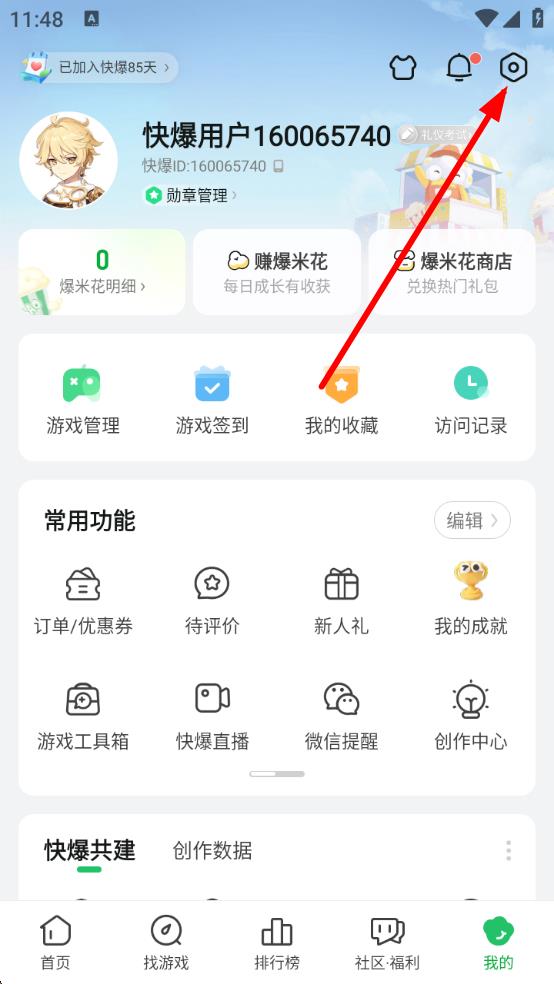 1、打开好游快爆APP,点击底部导航栏的我的进入个人中心,再点击右上角设置图标,进入设置页面。