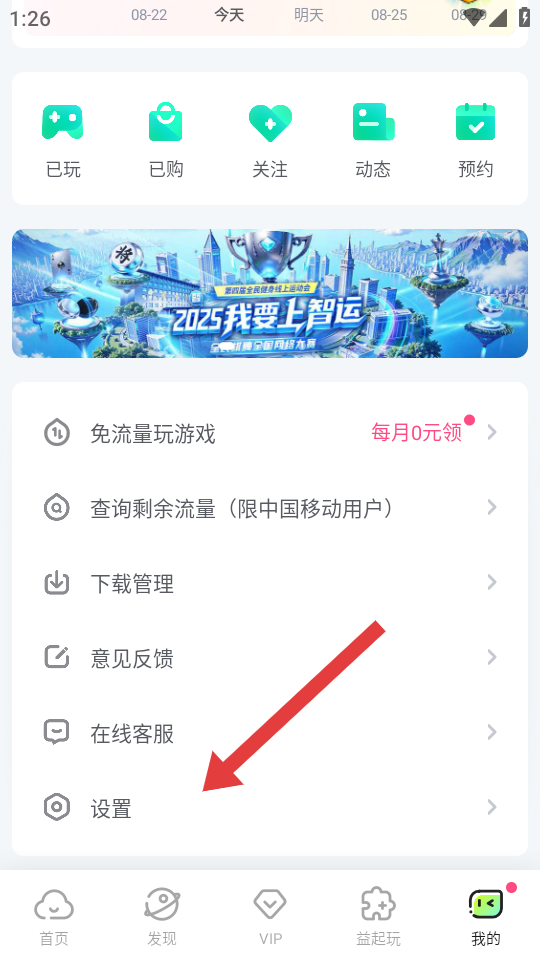 1、进入到咪咕快游我的页面,需要找到并点击最下面设置的选项,这是进入账号操作的前置步骤。
