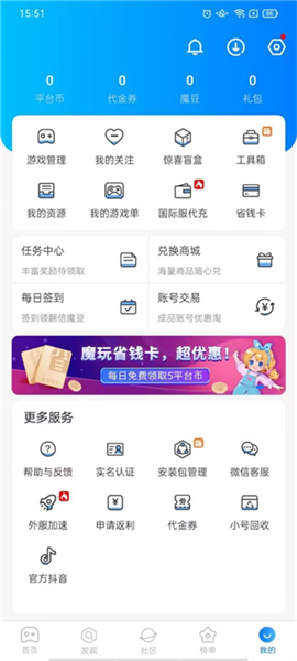 5、最后在我的板块中,支持玩家进行每日签到、游戏代充、游戏加速等各种操作;