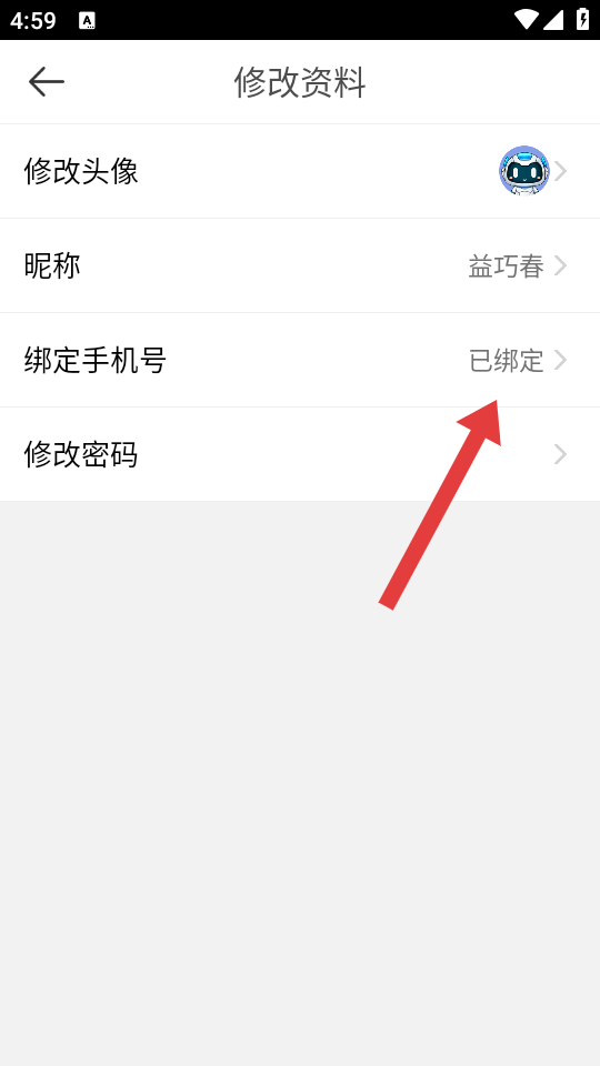 2、在修改资料页面,点击绑定手机号的选项,进入绑定手机的页面。