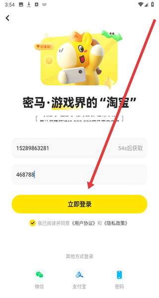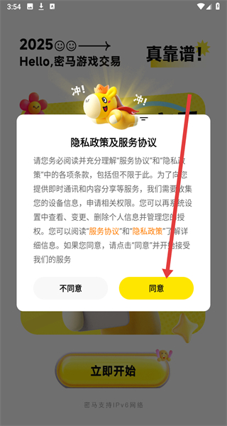 1、在密马游戏交易APP的“隐私政策及服务协议”弹窗点击“同意”,进入主界面。