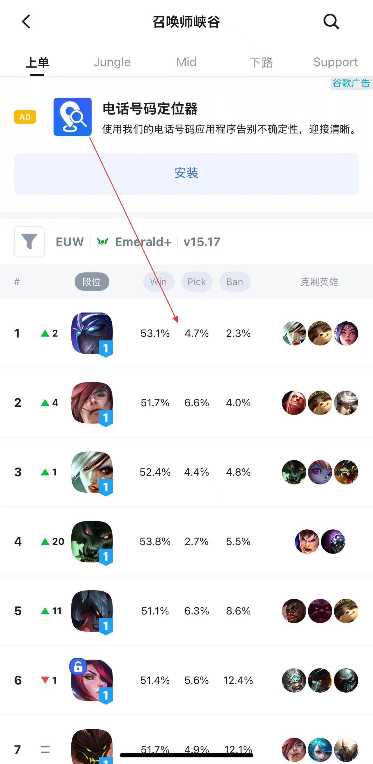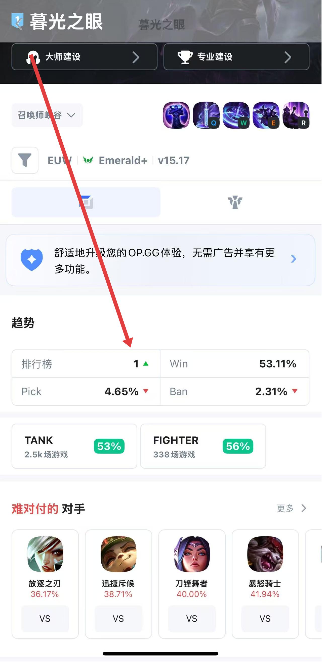 3、进入英雄详情页后,能看到该英雄的排行榜、胜率等战绩相关数据,下滑还可了解其面对不同对手时的胜率情况。