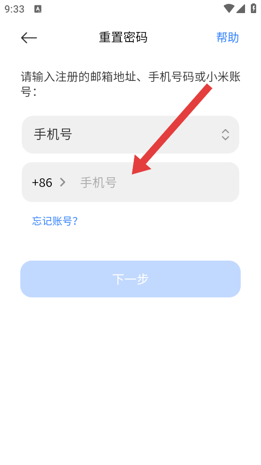 2、在重置密码页面,输入注册所用的邮箱地址、手机号码或小米账号,选择手机号输入框并填写对应号码,然后点击下一步。