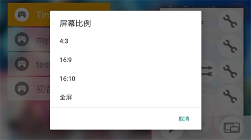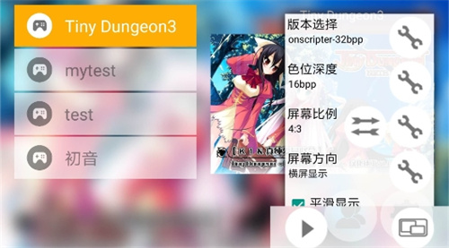 7、点击一个游戏,在选择列表上会显示一个扳手按钮和一个播放按钮,点击播放可直接运行游戏点击扳手则打开设置菜单,一般游戏使用默认设置即可,点击播放按钮运行游戏