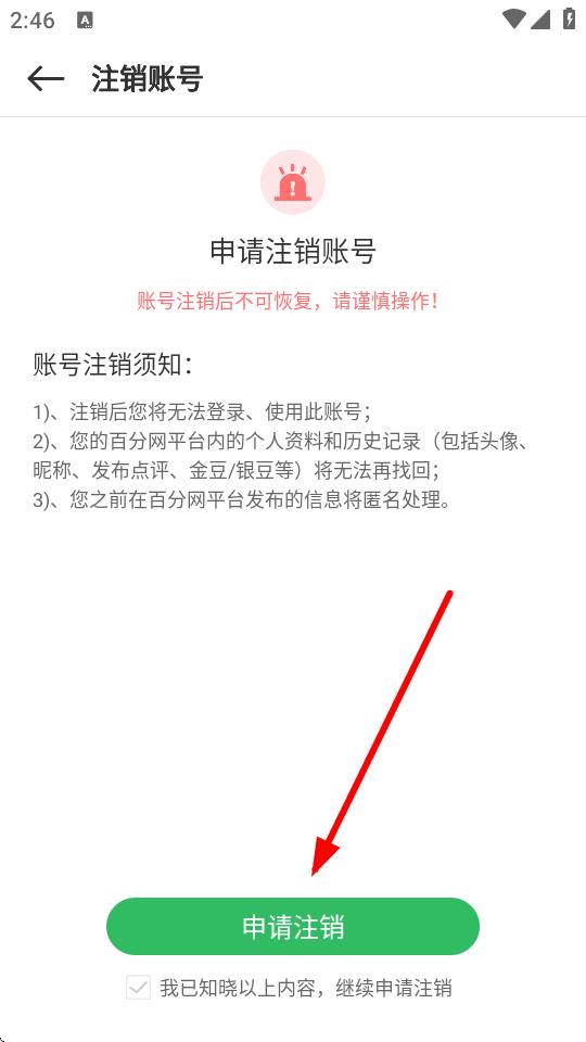 4、在注销账号页面,仔细阅读账号注销须知,勾选同意相关条款后,点击申请注销按钮,即可完成账号注销申请。