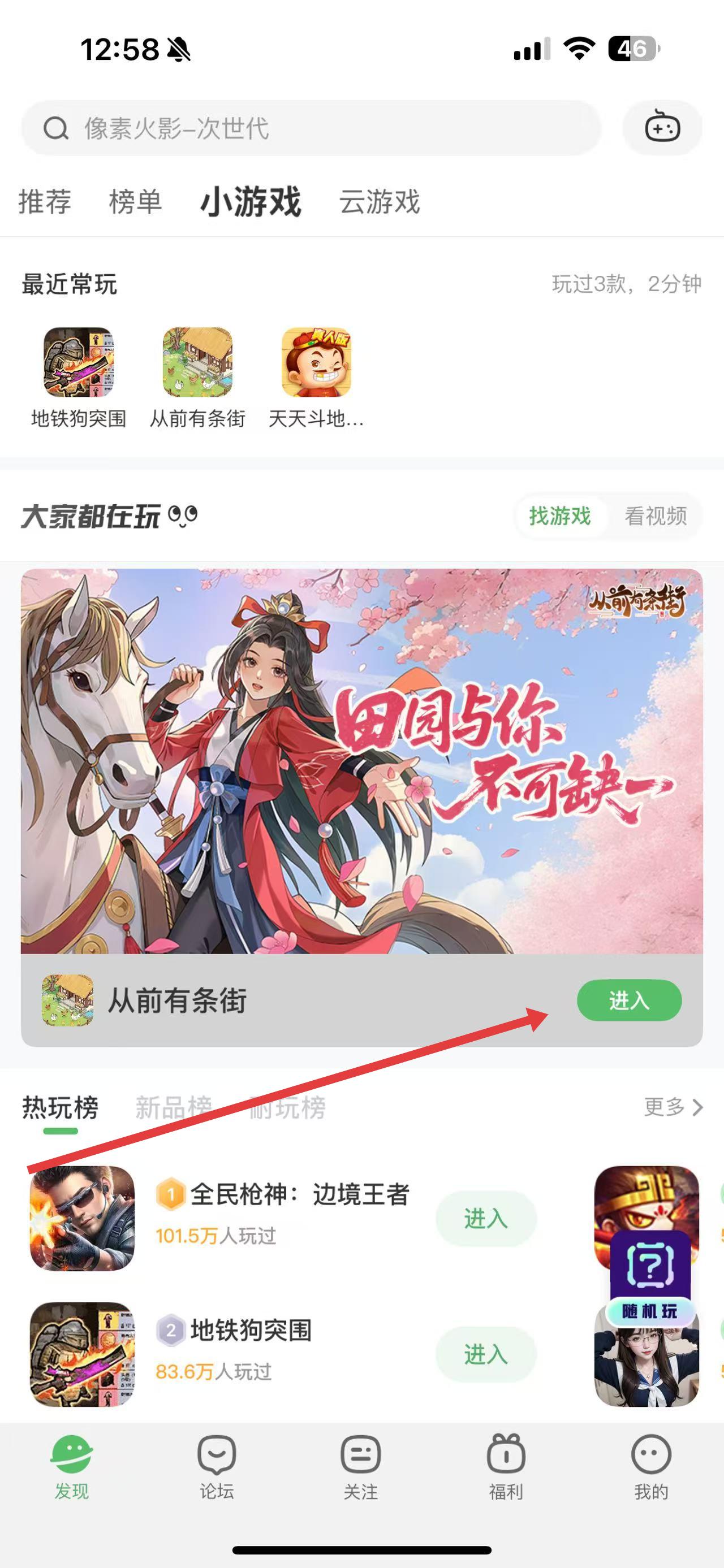 2、找到感兴趣的游戏,比如在展示列表中看到从前有条街,点击其对应的进入按钮,加载游戏内容。