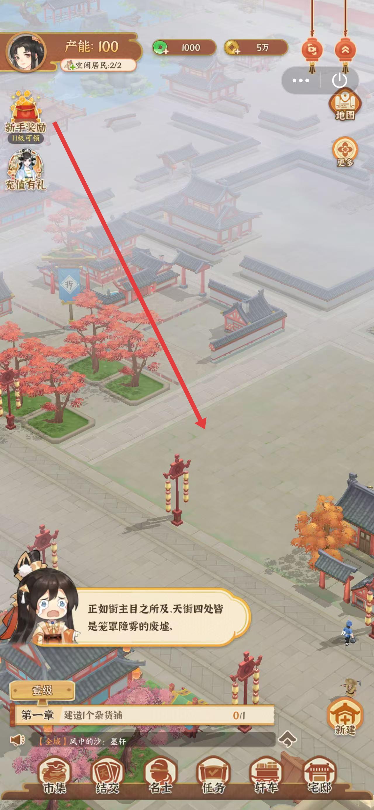 3、游戏加载完成进入界面后,依据游戏内指引操作,像按提示建造1个杂货铺,逐步熟悉玩法开启游戏体验。