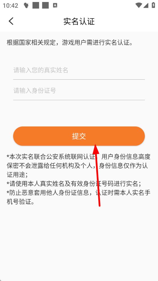 3、在实名认证界面按要求输入真实姓名和身份证号,确认无误后点击提交完成实名认证。