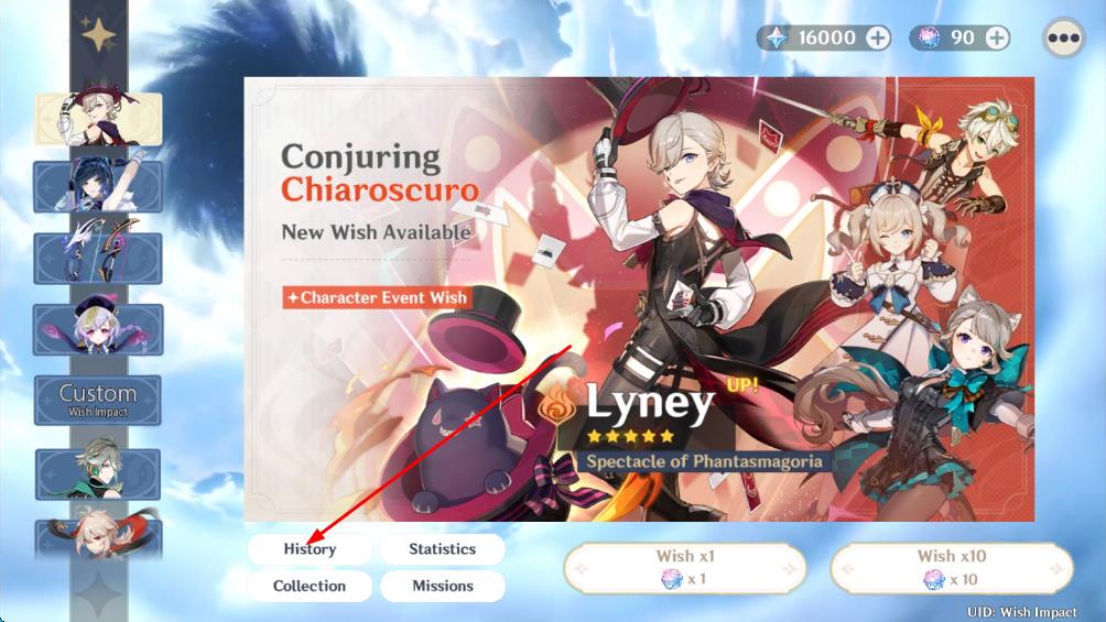 1、打开原神抽卡模拟器应用,进入其主界面,在界面中找到History的按钮并点击。