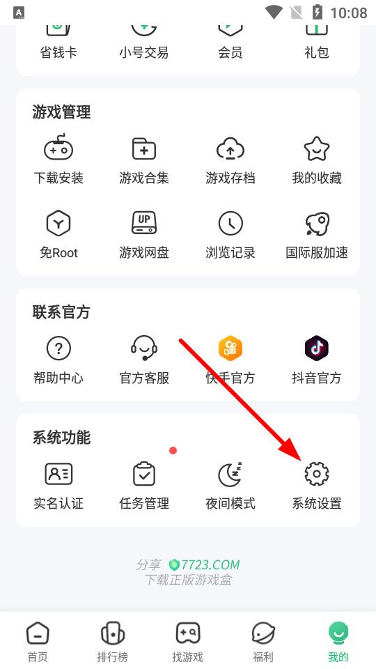 1、打开7723游戏盒APP,点击右下角我的进入个人中心页面,下滑找到系统功能板块。